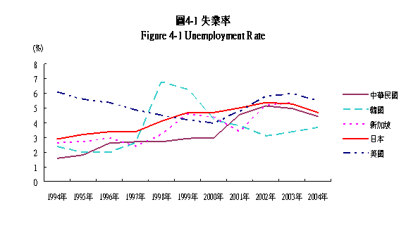 近十年來日本經濟低迷不振,失業率由1994年之2.9%,逐年上升至2002年之5.4%,受景氣復甦影響2004年降為4.7%。韓國1994年至1997年失業率均在2∼2.6%之間,1998年因受亞洲金融風暴影響,失業率大幅增至6.8%,近年來因資訊軟體服務產業快速發展,失業率維持在較低水準,2004年為3.7%。