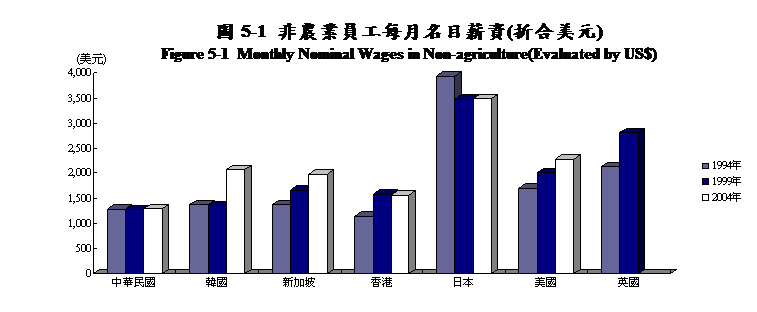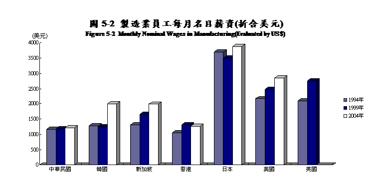 與各主要國家比較,2004年美國製造業員工每月名目薪資為2,853.55美元、日本為3,880.21美元、新加坡為1,982.25美元、韓國為1,990.47美元;綜上資料,美國約為我國之2.35倍、日本為3.19倍、新加坡為1.63倍、韓國為1.64倍。