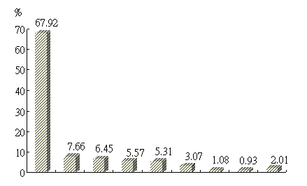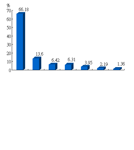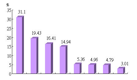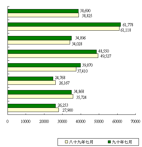 一、九十年七月工業及服務業受雇員工人數為5,579千人,各職類結構所占比率依次為技術工占23.19%、事務工作人員占20.24%、非技術工及體力工占15.48%、主管及監督人員占13.97%、專技人員占12.69%、助理專業人員占7.38%、服務工作人員及售貨員占7.06%。若與上年同月比較,各職類結構微幅變動,技術工(減少0.49個百分點)、非技術工及體力工(減少0.48個百分點)及服務工作人員及售貨員(減少0.29個百分點)等三職類所占比重較上年同月略減,其餘各職類均增加。