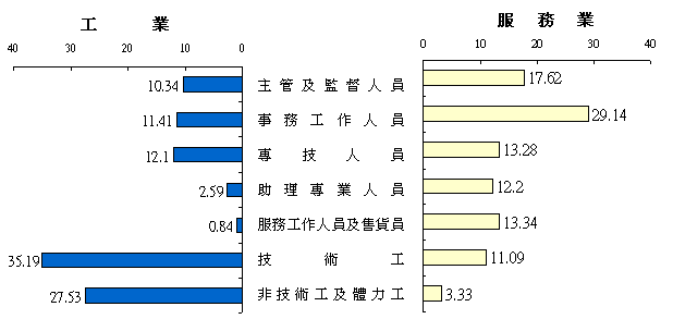 二、按部門別觀察,工業部門以技術工占35.19%最高,非技術工及體力工占27.53%次之;服務業部門則以事務工作人員占29.14%最高,餘依次為主管及監督人員占17.62%、服務工作人員及售貨員占13.34%、專技人員占13.28%、助理專業人員12.2%及技術工11.09%,非技術工及體力工僅占3.33%。