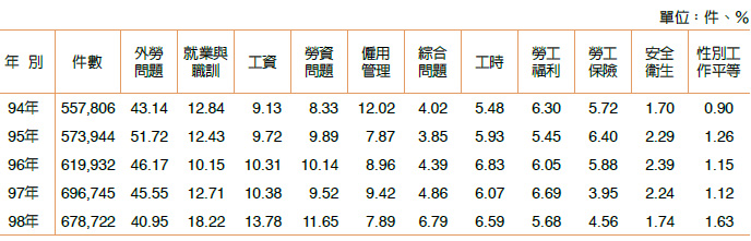 | 98年勞工服務中心服務諮詢案件—按服務性質分 |