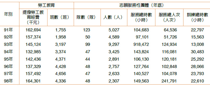 為整合社會人力資源,使願意投入志願服務工作之國民力量做最有效之運用,各級勞工行政機關依據志願服務法輔導成立志願服務團體,98年志願服務性團體計48隊,較上年增加1隊,人數2,307人,較上年減少326人或減12.38%,共服務14萬9,563小時,服務24萬1,791人次,志願服務性團體訓練總時數為2萬2,610小時。