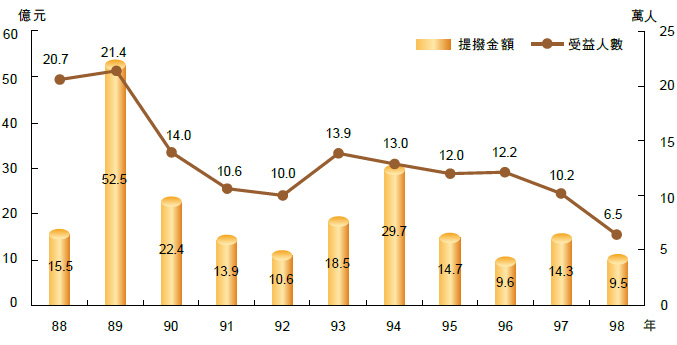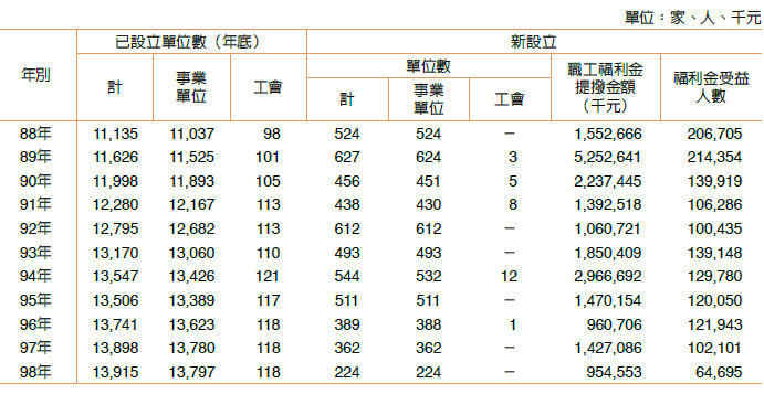 依據職工福利金條例規定,凡公營、私營之工廠、礦場或其他企業組織,均應提撥職工福利金,辦理職工福利事業。至98年底已設立職工福利機構單位共計13,915家,其中事業單位13,797家,較上年增加17家,工會118家,與上年度相同,而98年新設立者共224家,全為事業單位,職工福利金提撥金額為9億5,455萬3千元,福利金受益人數(含職工及眷屬)共6萬4,695人。 |