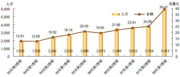 98年受到國際金融海嘯影響,全球景氣低迷,國內失業率攀升,非自願性失業人數增加,補助件數達9千6百餘件,總補助金額645萬,皆為開辦以來最高;自開辦累計至98年底止,共補助3萬907名失業勞工人次,嘉惠4萬4,602名學生人次,補助金額3億214萬元,其中大專院校(含五專後三年)2萬6,487
