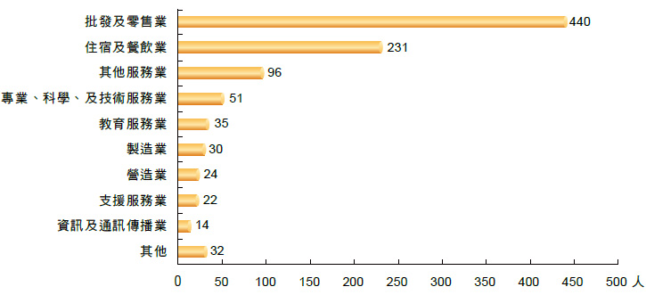-230萬元」238人,兩者合計占52.18%;依行業別分,批發及零售業440人最多,住宿及餐飲業231人次之,其他服務業96人排第三。