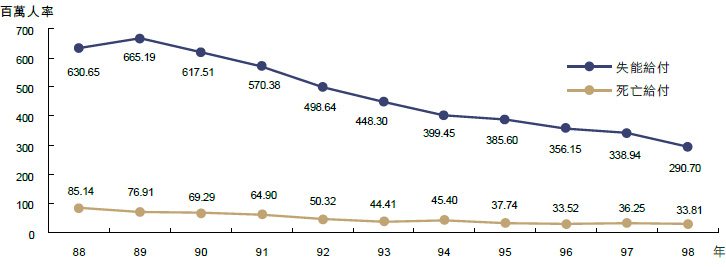 98年職業傷害死亡百萬人率為33.81較上年減少2.44個百萬人率,相較88年的85.14,降幅達60.29%。職業傷害失能百萬人率自89年後逐年下降,98年為290.70,較上年減少48.24個百萬人率,相較89年的665.19,降幅達56.30%。 |