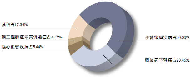 按職業病成因分析,因「手臂肩頸疾病」者有239人次,占50.00%居首,其次是「職業性下背痛」者有136人次,占28.45%,「腦心血管疾病」26人次,占5.44%居第三。
