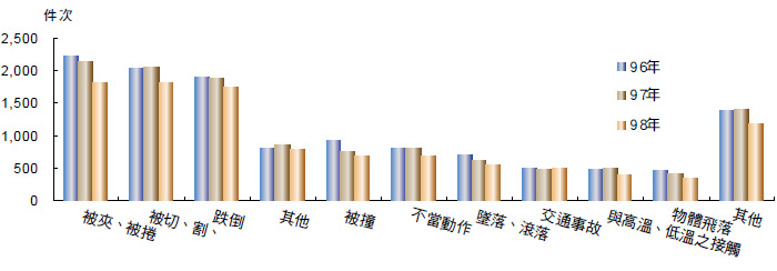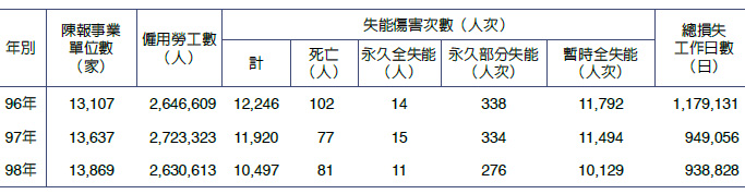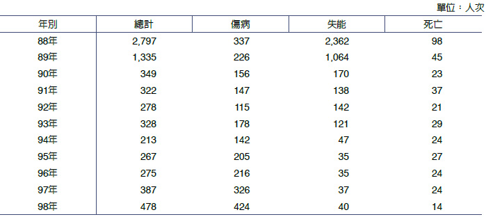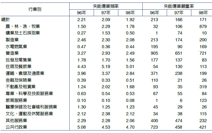 98年發生失能傷害共計10,497人次,其中死亡81人,永久失能11人,永久部分失能276人次,暫時全失能10,129人次。失能傷害頻率為1.92,較上年減8.13%,失能傷害嚴重率為171,較上增加3.01%。