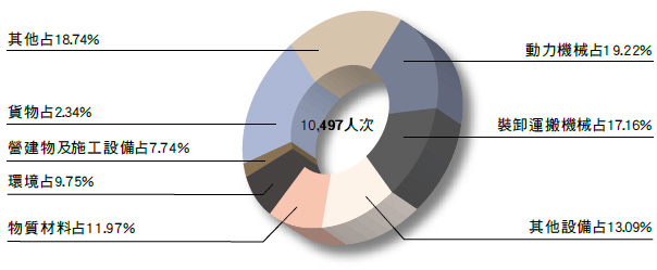 次,占17.35%次之,「跌倒」1,744人次,占16.61%再次之,上述為勞工發生職業災害之主要三大類型。而導致勞工發生失能傷害之媒介物,「動力機械」占19.22%為首,「裝卸搬運機械」占17.16%居
