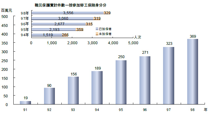 98年補助未投勞工保險之職業災害勞工329人次,已投保者3,556人次,補助金額計3.2億元,職業災害預防及職業災害勞工重建補助計5,326萬元。