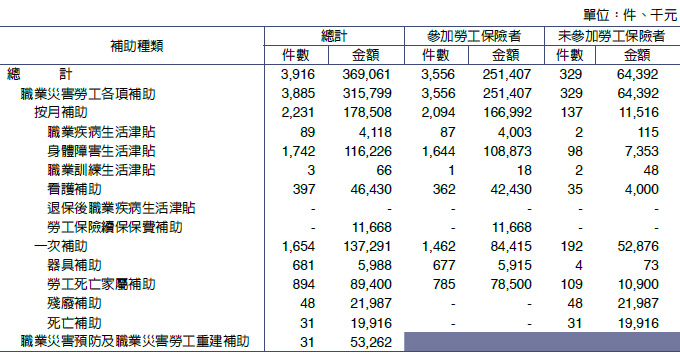 為加強辦理職業災害預防及補助遭遇職業災害之勞工,91年起施行「職業災害勞工保護法」,補助金額自91年的2千萬元逐年遞增至98年的3.7億元。補助種類分:1.針對職業災害勞工 (包括已加入勞工保險者及未加入勞工保險者)